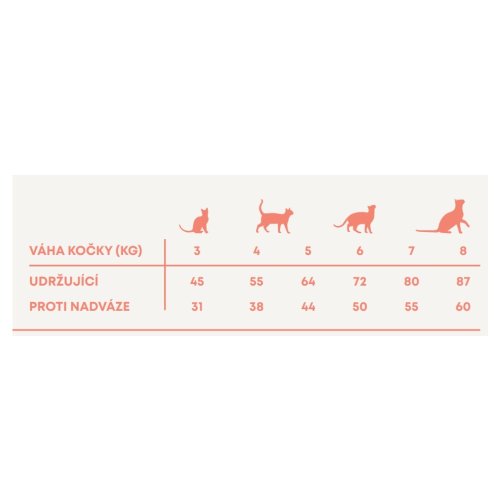 Kŕmny návod: zmenu krmiva je potrebné vykonávať postupne po dobu 7 dní. Ako návod použite tabuľku s dávkovaním. Denné množstvo potravy sa môže pre každú mačku líšiť, záleží na úrovni jej aktivity, plemene a podmienkach prostredia. Dennú kŕmnu dávku podávajte rozdelenú na 2 porcie denne, nepoužívajte zvyšky krmiva z predchádzajúceho dňa. Mačka musí mať vždy prístup k čistej, čerstvej vode. Skladovanie: skladujte na chladnom a suchom mieste. Obal by mal byť po použití vždy bezpečne uzavretý.