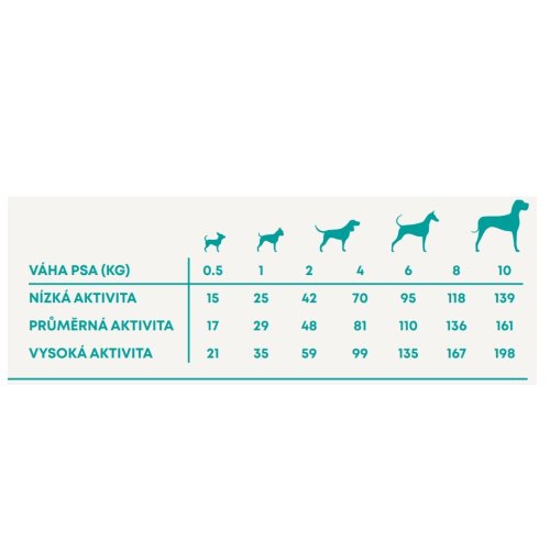 Kŕmny návod: zmenu krmiva je potrebné vykonávať postupne po dobu 7 dní. Ako návod použite tabuľku s dávkovaním. Denné množstvo potravy sa môže pre každého psa líšiť, záleží na úrovni jeho aktivity, plemene a podmienkach prostredia. Dennú kŕmnu dávku podávajte prednostne rozdelenú na 2 až 3 porcie denne, a to vždy v rovnakom čase. Pes musí mať vždy prístup k čistej, čerstvej vode. Skladovanie: skladujte na chladnom a suchom mieste. Obal by mal byť po použití vždy bezpečne uzavretý.