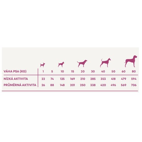 Kŕmny návod: zmenu krmiva je potrebné vykonávať postupne po dobu 7 dní. Ako návod použite tabuľku s dávkovaním. Denné množstvo potravy sa môže pre každého psa líšiť, záleží na úrovni jeho aktivity, plemene a podmienkach prostredia. Dennú kŕmnu dávku podávajte prednostne rozdelenú na 2 až 3 porcie denne, a to vždy v rovnakom čase. Pes musí mať vždy prístup k čistej, čerstvej vode. Skladovanie: skladujte na chladnom a suchom mieste. Obal by mal byť po použití vždy bezpečne uzavretý.