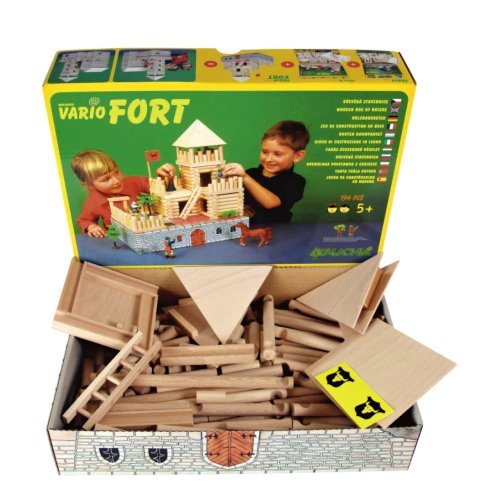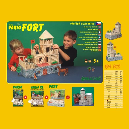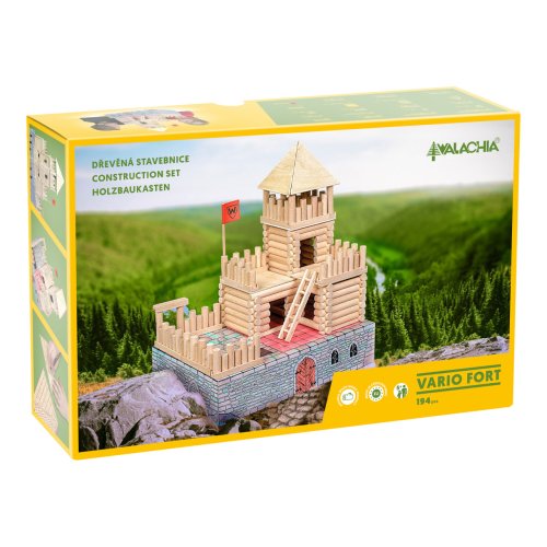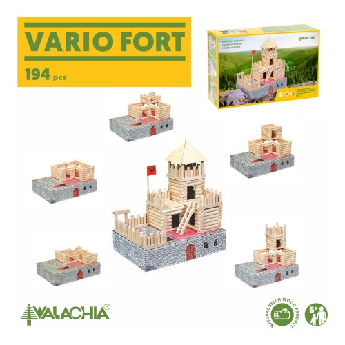 VARIO Fort je stavebnica stredovekého hradu z masívneho bukového dreva s priemerom 15 mm. Hrad je možné postaviť hneď v niekoľkých variantoch. Pevná kartónová krabica obalu je prispôsobená potlačou tak, že dotvára hradby. Počet dielov: 194