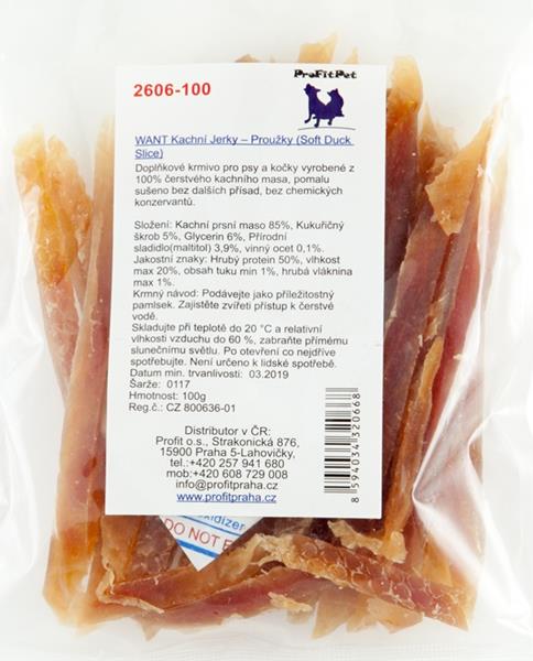 Zloženie: Kačacie prsné mäso 85%, Kukuričný škrob 5%, Glycerín 6%, Prírodné sladidlo (maltitol) 3,9%, vínny ocot 0,1%