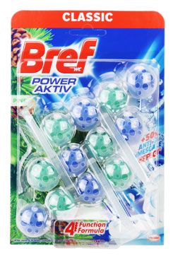 Bref Power Aktiv: je zložený zo 4 guličiek uložených v priehľadnom nerozoberateľné košíka, ktoré ako jeden týmzvládnou viac funkcií pri každom spláchnutí - hygienickú čistotu, príjemnú vôňu, odstránenie usadenín a vytvorenie bohatej peny pre lesk a belosť toalety.