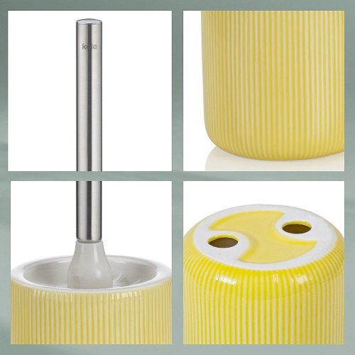 Toaletná sada Ava je vyrobená z keramiky av slnečno žltej farbe oživí vašu kúpeľňu. Rukoväť toaletnej štetky je vyrobená z lesklej nerezovej ocele, čo dodáva eleganciu a zároveň je praktická. Toaletný set vybavený kefou La Brossa v elegantnej čiernej farbe, ktorý môžete ľahko odskrutkovať a kedykoľvek vymeniť.