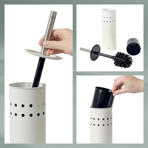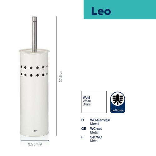 Uzavretá toaletná súprava Leo je vyrobená z kovu s práškovým nástrekom a zdobená perforovaným vzorom po celom obvode. Rukoväť toaletnej štetky je z nerezovej ocele a je možné ju v prípade potreby vymeniť rovnako ako hlavicu štetky. Vnútorná plastová nádoba zachytáva odkvapkávajúcu vodu a je možné ju ľahko vybrať pre vyprázdnenie a čistenie.