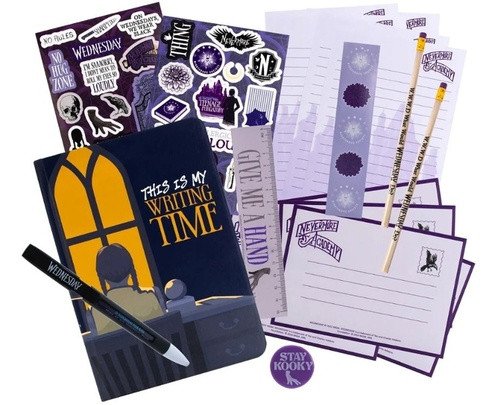 Darčekový box obsahuje úložný box, blok A5, pero, 7 hárkov samolepiek, 2 ceruzky, 12 listových papierov, gumy, 6 obálok, pravítko
