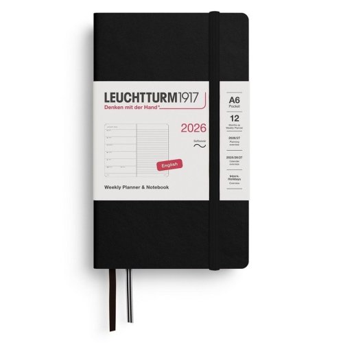 Detaily:<br> • Január 2026 – december 2026<br> • 7 dní na stránku<br> • Týždenný kalendár na jednej strane a poznámky na opačnej<br> • 144 strán<br> • 3-ročný prehľad<br> • Fáza Mesiaca<br> • Oficiálne sviatky v 58 krajinách<br> poznámky<br> • Všité zadné vrecko<br> • 2 látkové záložky<br> • Elastický pásik na uzavretie diára<br> • Šitá väzba sa otvára naplocho<br> • Sada samolepiek pre etiketovanie a archiváciu<br> <br> Formát:<br> • Pocket (A6) 90; Mäkká väzba, papier 80 g/m2