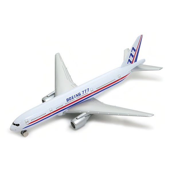 Miniatúra dopravného lietadla Boeing 777 z kovu a plastu. Dodávané v rôznofarebnej papierovej krabičke s plastovým priehľadom. Hlavné vlastnosti: kovové prevedenie