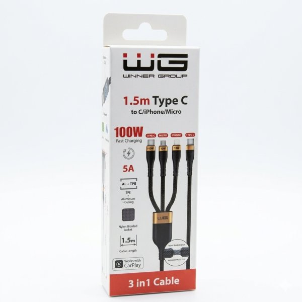 WG Dátový kábel Type-C_Type-C/Lightning/micro sa hodí do každej domácnosti. Vďaka tomuto výrobku vám stačí jeden kábel na nabíjanie troch rôznych typov zariadení – moderných Type-C, Apple zariadení s Lightning slotom a starších zariadení s micro-USB. Kombinácia z Type-C na Type-C umožňuje nabíjanie až s výkonom 100 W. Zariadenie so slotom Lightning umožňuje kábel nabíjať až 18W výkonom a staršie zariadenie s micro-USB slotom 10W výkonom.