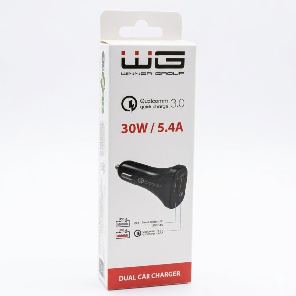 Praktická nabíjačka značky WG do 12/24V zásuvky vášho vozidla, vďaka ktorej dvom USB-A slotom môžete nabíjať až dve zariadenia súčasne.