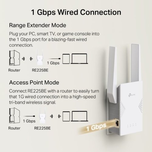 Zrýchlite svoju sieť pomocou extendera RE225BE a využite výhody najnovšej technológie Wi-Fi 7 . Vďaka kombinovanej rýchlosti až 3,6 Gb/s a pokročilým technológiám, ako je 4K-QAM alebo 160 MHz kanál , získate nielen vysoký výkon, ale aj stabilitu a nízku odozvu. Dve výkonné antény a vlastná optimalizácia pripojenia zaistia spoľahlivé pokrytie v každej miestnosti – bez mŕtvych zón a bez kompromisov.