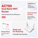 WiFi router Mercusys MR20 AC750 vám poskytne rýchle pripojenie pre všetky vaše zariadenia. Zaisťuje dvojpásmovú Wi-Fi sieť s rýchlosťou až 750 Mb/s (433 Mb/sv pásme 5 GHz a 300 Mb/sv pásme 2,4 GHz), vďaka ktorej si doprajete dokonalé podmienky pre prácu alebo zábavu. Prvé pásmo sa hodí prevažne na zdieľanie odkazov, posielanie emailov a surfovanie na internete. Druhé pásmo je silnejšie a zvládne aj náročnejšie úlohy ako streamovanie HD videa, hranie hier a podobne.