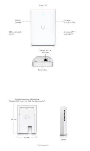 Zháňate domov kvalitný Wi-Fi router s výborným pokrytím? Zaobstarajte si trojpásmový access point Ubiquiti U7 Pro Wall s podporou Wi-Fi 7. K sieti ho pripojíte pomocou štandardného LAN portu s rýchlosťou až 2,5 Gb/s . V 2,4 GHz pásme poskytuje rýchlosť 688 Mb/s , v 5GHz rýchlosť 4,3 Gb/s av 6GHz rýchlosť 5,7 Gb/s . Jeho maximálna spotreba je 22 W a napájaný je pomocou protokolu PoE+ . Môžete k nemu pripojiť viac ako 300 zariadení naraz.