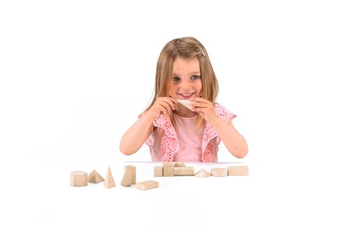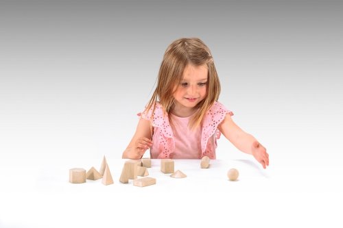 14 rôznych drevených geometrických telies, ktoré slúžia na hranie, ale sú vhodné aj ako učebná pomôcka. Rozpoznáte a pomenujete ich správne všetky? Vďaka týmto kockám získa dieťa pojem o slovách ako je plocha, hrana, roh, strana, uhlopriečka, úsečka, pravý uhol či kolmica. Ukážte mu, ako vyzerá kocka, kváder, hranol, valec, ihlan, kužeľ či guľa. Vyrobené zo 100% recyklovaných materiálov, má certifikáciu PEFC a po použití ho je možné opakovane recyklovať. Hlavné vlastnosti: obsahuje 14 dielov vhodné ako učebná pomôcka k ranému učeniu geometrie vyrobených v Nemecku