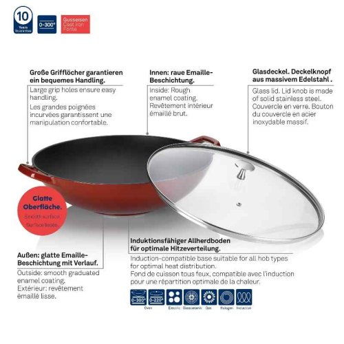 - materiál: liatina - smaltovaný povrch - pokrievka s nerezovým úchytom - priemer: 36 cm - výška: 10 cm - objem: 2,5 L - farba: červená / čierna - séria: CALIDO - značka: KELA