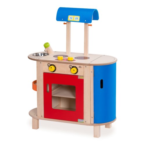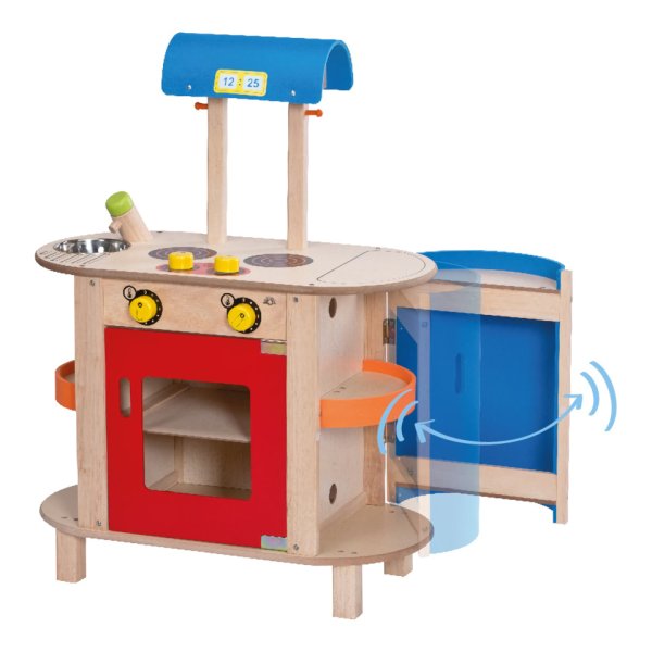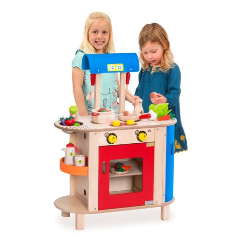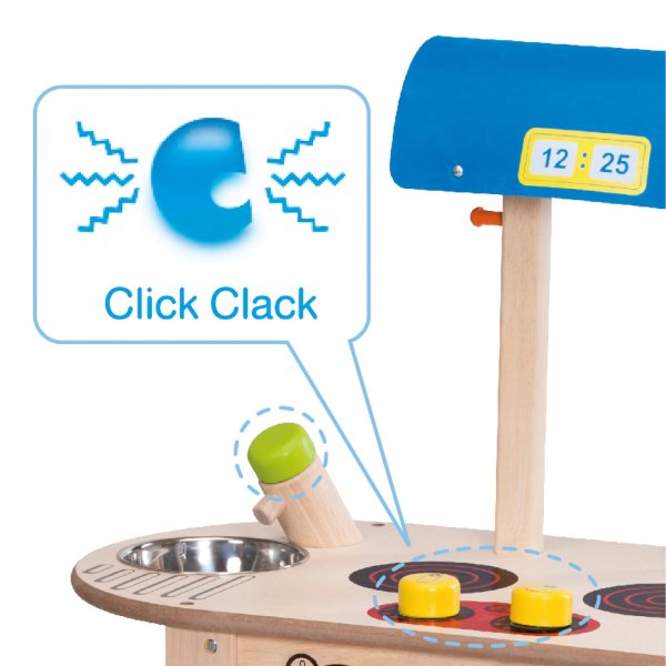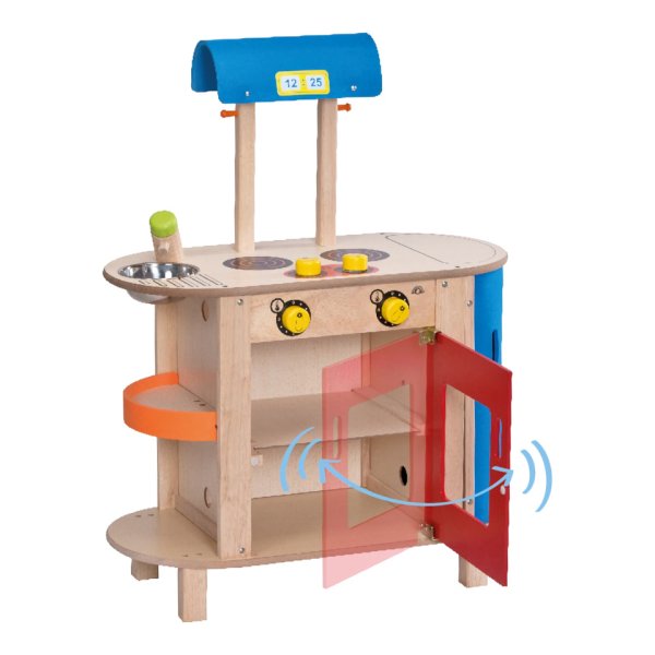 Moderne vyzerajúca kuchynka, ktorá ponúka hodiny zábavy. Ponúka sporák so vstavanou rúrou a dvojplatničkovou varnou doskou. K tým sú pridružené ovládače, ktorých otáčanie sprevádza cvakavé zvuky dodávajúce hrám na uveriteľnosti. Kuchynka má ďalej vstavanú chladničku, drez s batériou taktiež poskytujúci zvukovú odozvu, digestor a na boku poličky. Na poličkách a vo vnútri spotrebičov, za dvierkami s magnetickým zatváraním, ponúka praktické úložné priestory. Pod digestorom je tiež vybavená dvojicou háčikov pre kuchynské náčinie. Výrobok vyžaduje montáž, dodávané s obrázkovým návodom na zostavenie. Hlavné vlastnosti: multifunkčný sporák, drez, chladnička a digestordvierka s magnetickým zatváraním zvukové efekty ovládanie spotrebičovúložné priestory