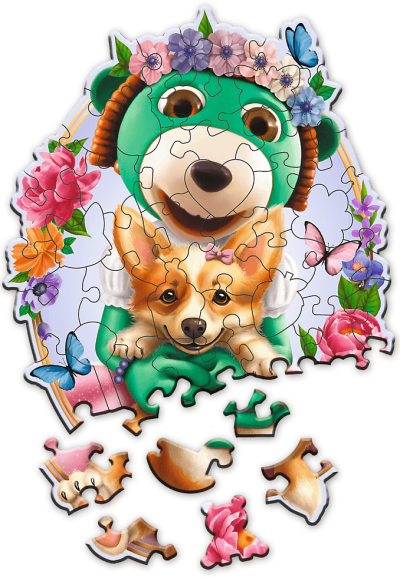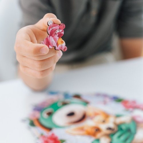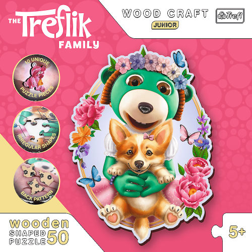 Drevené obojstranné puzzle TREFL z prémiového radu Wood Craft Junior so špeciálne tvarovanými dielikmi. Puzzle je vyrobené zo silnej drevovláknitej dosky a vyrezané laserom, vďaka čomu sú okraje hladké a dieliky do seba ľahko zapadajú.