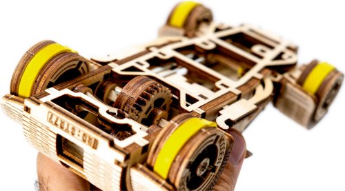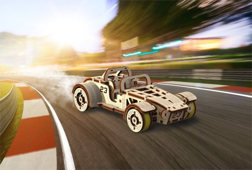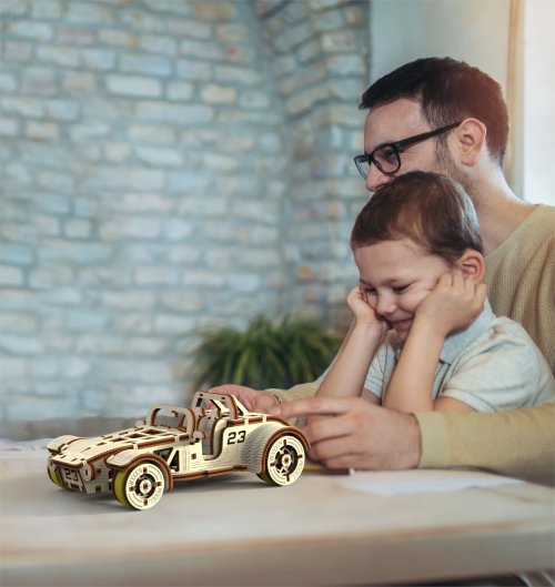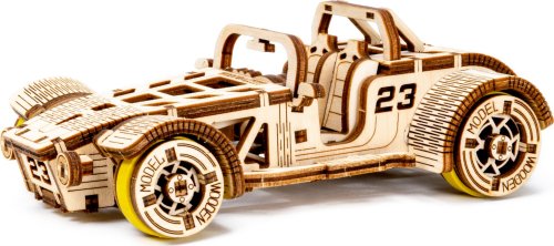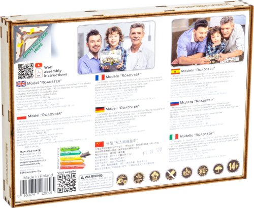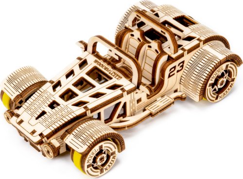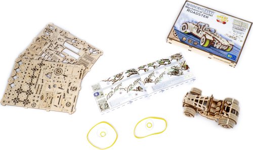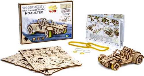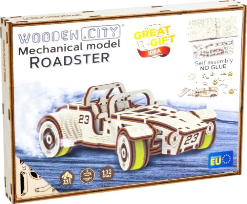 Športové vozidlo Roadster je vytvorené pre extrémne sebavedomé osoby. Roadster má dvojité sedadlo pre pohľadného pretekára a jeho krásnu priateľku. Zotrvačníkový mechanizmus, vratné kolesá, predné otočné kolesá, pogumované kolesá a dokonalý dizajn. Stačí prejsť cieľovou páskou a budeš naozajstným pretekárom. Model má niekoľko detailov skutočného automobilu: - poznávaciu značku, - predné otočné kolesá, - zotvačníkový mechanizmus, - vratné kolesá, - detailný motor, - dvojité sedadlo. 3D puzzle WOODEN CITY Roadster je skvelým darčekom pre každého milovníka športových vozidiel. Obtiažnosť: 3 z 5 (podľa rozdelenia Wooden City) Orientačná doba na zloženie: 2 hodiny Mierka: 1:32 Drevené 3D puzzle WOODEN CITY sú detailne prepracované funkčné mechanické modely, ktoré sa skladajú bez lepidla alebo náradia. Sú vyrobené z ekologických drevených materiálov - kvalitné brezové preglejky. S mechanickými drevenými puzzle WOODEN CITY zažijete hodiny zábavy pri skladaní a spoznáte prevody, gumičkové motory, ozubené kolieska a ďalšie súčiastky z bezprostrednej blízkosti.