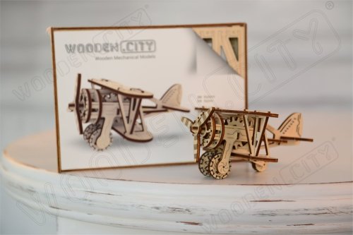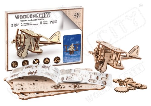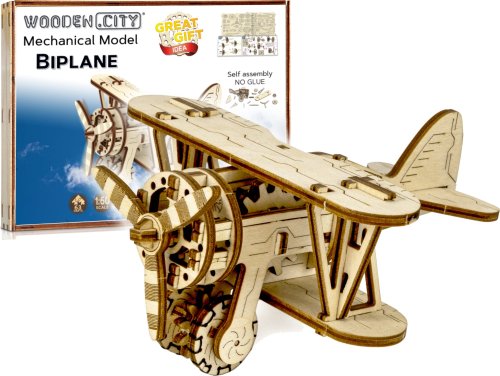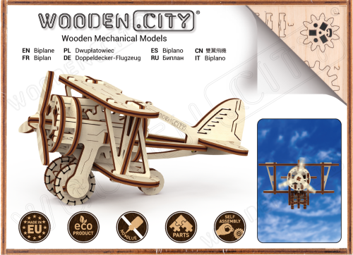 Divoká modrá obloha volá! Drevená mechanická stavebnica modelu Dvojplošníka má jedinečný design a prekvapivé detaily. Vydajte sa na vlastné dobrodružstvo Indiana Jonesa - s vlastným dvojplošníkom od WOODEN CITY si ľahko predstavíte, ako letíte vzduchom a utekáte pred prenasledovateľmi s otcovým denníkom, rovnako ako vo filme Indiana Jones a posledná krížová výprava. Ak ste romantik, potom poletíte v stopách francúzskeho spisovateľa a priekopníka letectva Antoina de Saint-Exupéryho, autora Malého princa. Na bývalom medzipristátí Aéropostale na letisku juhozápadne od marockého mesta Tarfaya sa nachádza vedľa seba malé múzeum so špeciálnym pamätníkom dvojplošníka, oboje venované Saint-Exupérymu. Model lietadla má vrtuľu poháňanú gumovými pásmi ("rezinomotor") s nastaviteľnou akceleráciou. Jej lopatky sa roztočia a lietadlo na rovnom povrchu rýchlo zrýchli. Užite si to! Ovládanie tohto špeciálneho lietadla je vo vašich rukách. 3D puzzle WOODEN CITY Biplane - Dvojplošník bude najlepším darčekom pre každého milovníka lietadiel. Obtiažnosť: 3 z 5 (podľa rozdelenia Wooden City) Orientačná doba na zloženie: 2 hodiny Mierka: 1:50 Drevené 3D puzzle WOODEN CITY sú detailne prepracované funkčné mechanické modely, ktoré sa skladajú bez lepidla alebo náradia. Sú vyrobené z ekologických drevených materiálov - kvalitné brezové preglejky. S mechanickými drevenými puzzle WOODEN CITY zažijete hodiny zábavy pri skladaní a spoznáte prevody, gumičkové motory, ozubené kolieska a ďalšie súčiastky z bezprostrednej blízkosti.