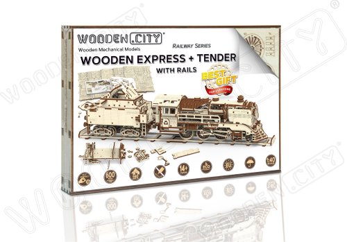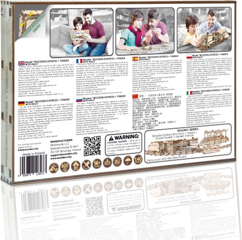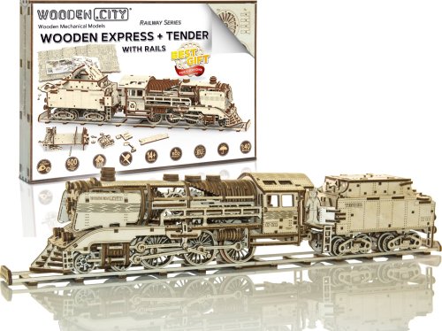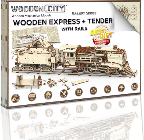 Táto úžasná sada bude skvelým spôsobom ako tráviť voľný čas. Dokonale navrhnutý drevený Express s tendrem a realistickými detailmi vám pomôže vrátiť sa do minulosti a oživiť svoje spomienky na detstvo. Zostavte model s kamarátmi alebo deťmi, postavte ho na internáty a užite si chvíle zábavy a šťastia v prítomnosti. - štartuje so špeciálnym kľúčom - dvierka od spaľovne - hnacie kolesá - spriahadlo spájajúce express a tender - jazdí dopredu, dozadu a dookola - zostavený model: 55,8 x 11 x 12,2 cm - rozmery koľají: 60 x 6,1 x 1 ,5 cm