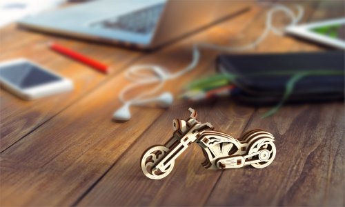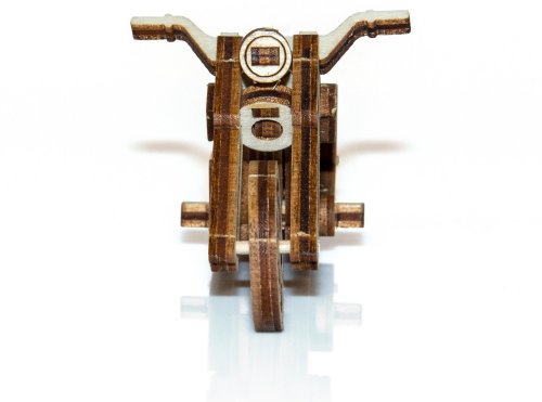 Drevená mechanická stavebnica sady Drobností - Widgets obsahuje mini model motorky, ktorý si môžete len tak vystaviť alebo darovať pre radosť.