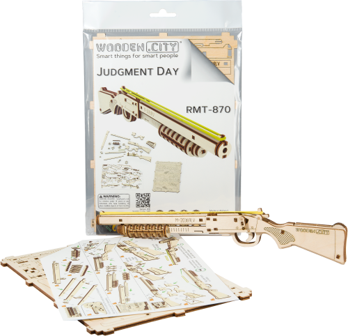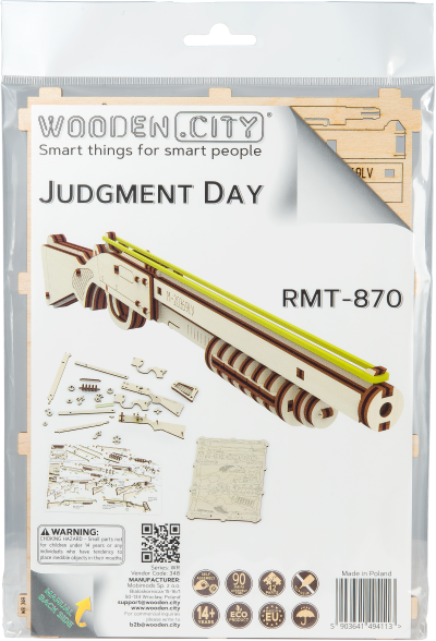 Drevená mechanická stavebnica skutočnej zbrane Judgment Day RMT-870 je určená pre skutočných odvážlivcov. Okrem odvahy budete musieť pri zostavovaní tohto modelu uplatniť aj inteligenciu. Vďaka jedinečnému dizajnu a prekvapivým detailom tohto modelu bude vaše trávenie času plné zábavy. V modeli sú zastúpené detaily skutočnej zbrane: - model strieľa špeciálnymi nábojmi v podobe gumičiek (súčasťou výrobku), - naraz je možné vystreliť až päť gumičiek (pre nabitie pušky nasaďte každú gumičku zvlášť viď detail č.24), - poistka a zásobník nábojov. 3D puzzle WOODEN CITY Judgment Day RMT-870 bude výborným darčekom pre každého milovníka strelných zbraní. Orientačná doba na zloženie: 1,5 hodiny Drevené 3D puzzle WOODEN CITY sú detailne prepracované funkčné mechanické modely, ktoré sa skladajú bez lepidla alebo náradia. Sú vyrobené z ekologických drevených materiálov - kvalitné brezové preglejky. S mechanickými drevenými puzzle WOODEN CITY zažijete hodiny zábavy pri skladaní a spoznáte prevody, gumičkové motory, ozubené kolieska a ďalšie súčiastky z bezprostrednej blízkosti.