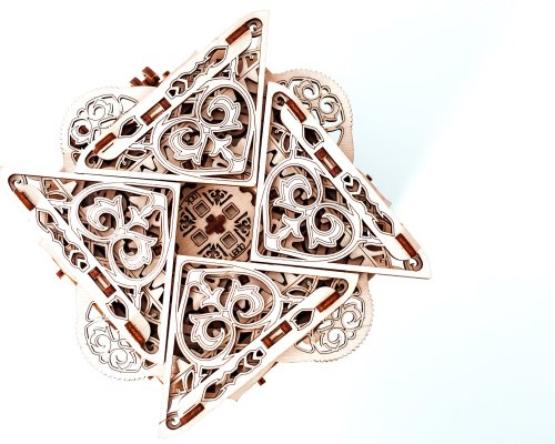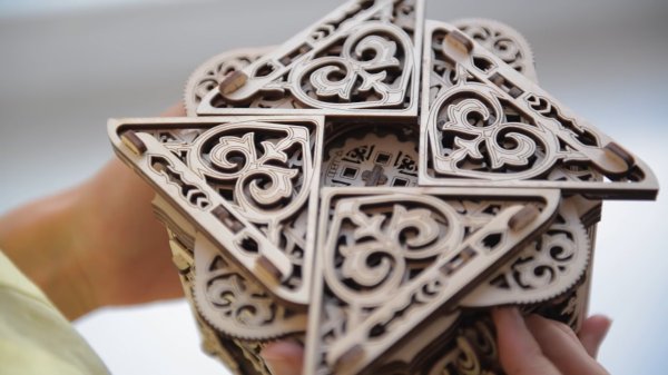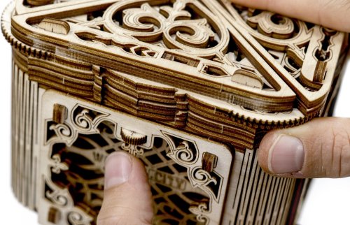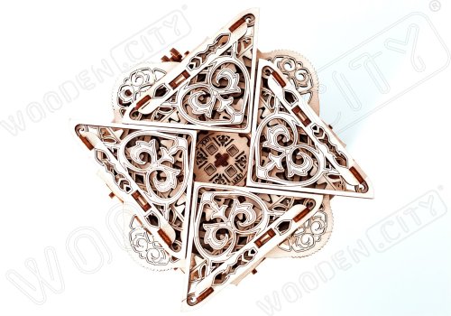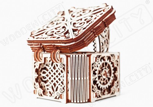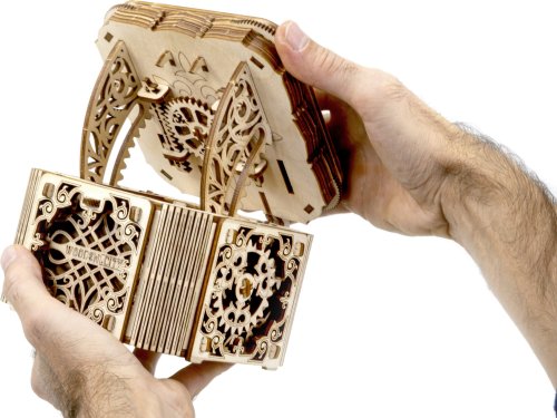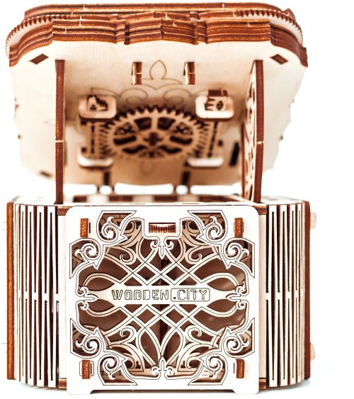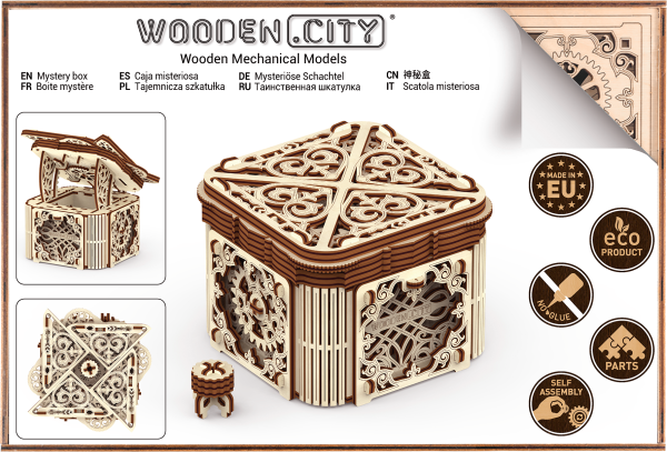 Ako najlepšie uchovávať tajomstvo a poklady? Na to skvele poslúži drevená mechanická schránka inšpirovaná legendou o Piatom elemente. Vďaka jedinečnému dizajnu a prekvapivým detailom tohto modelu bude vaše trávenie času plné zábavy a skvelých emócií. Ako tajomnú skrinku otvoriť, nie je tak ľahké uhádnuť. Ten, kto ju dostane ako hotový darček, bude musieť chvíľu premýšľať. Model je zhmotnením umeleckého remesla: - veko sa otvára kľúčom, ktorý spája 4 trojuholníky, - štyri živly: myseľ, telo, zrak a sluch, - piatym je láska, ktorá otvorí všetky zámky. 3D puzzle WOODEN CITY Mystery Box je neobvyklým darčekom pre milovníkov krásy a prekvapenia. Obtiažnosť: 4 z 5 (podľa rozdelenia Wooden City) Orientačná doba na zloženie: 5 hodín Drevené 3D puzzle WOODEN CITY sú detailne prepracované funkčné mechanické modely, ktoré sa skladajú bez lepidla alebo náradia. Sú vyrobené z ekologických drevených materiálov - kvalitné brezové preglejky. S mechanickými drevenými puzzle WOODEN CITY zažijete hodiny zábavy pri skladaní a spoznáte prevody, gumičkové motory, ozubené kolieska a ďalšie súčiastky z bezprostrednej blízkosti.