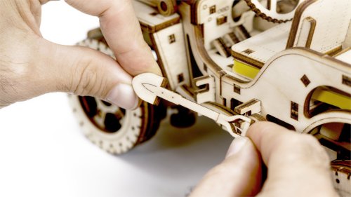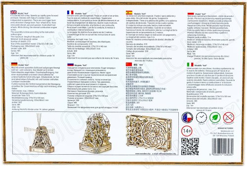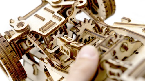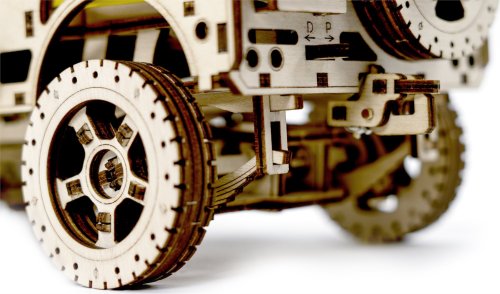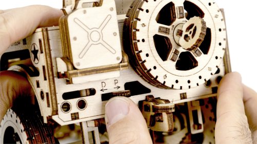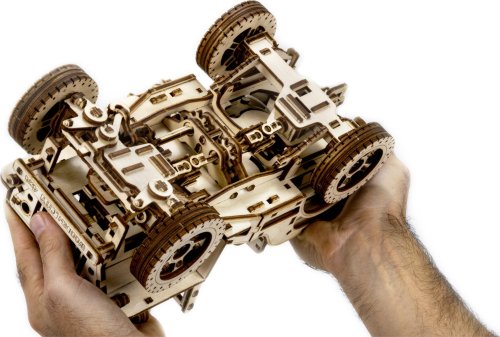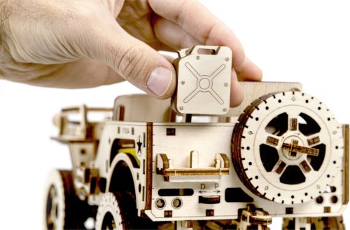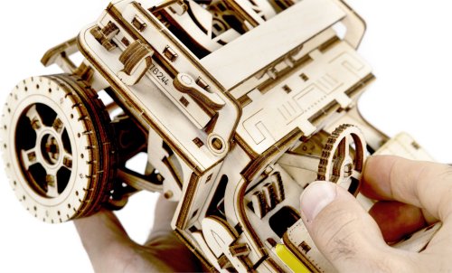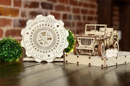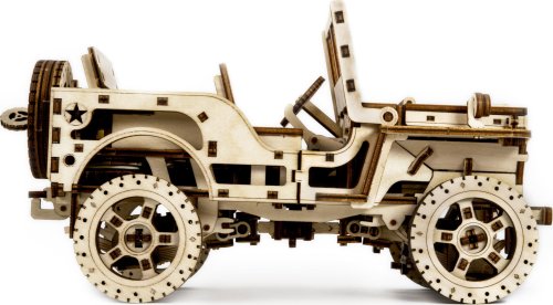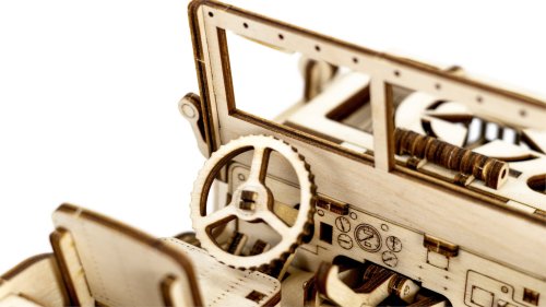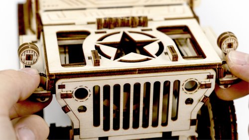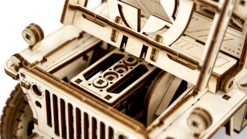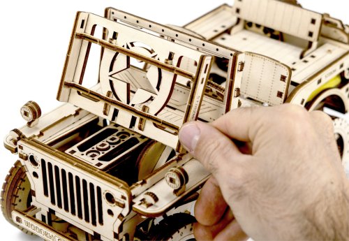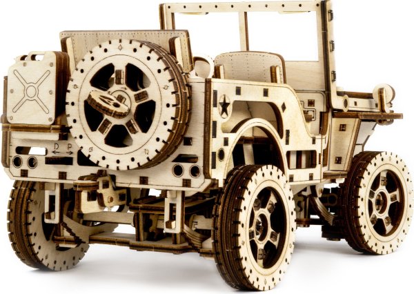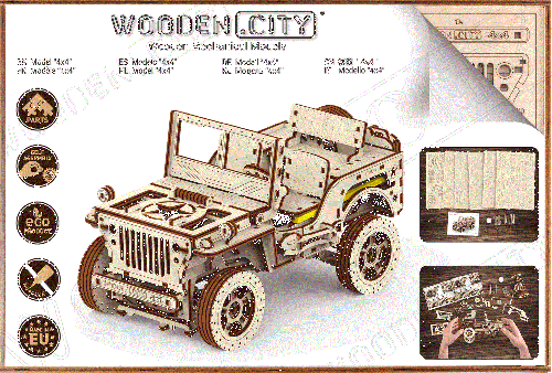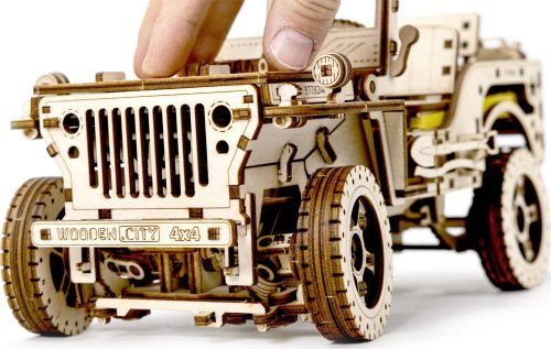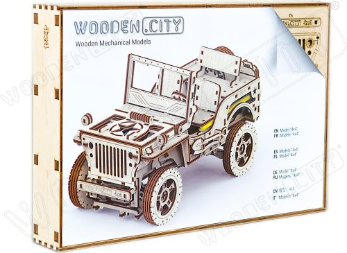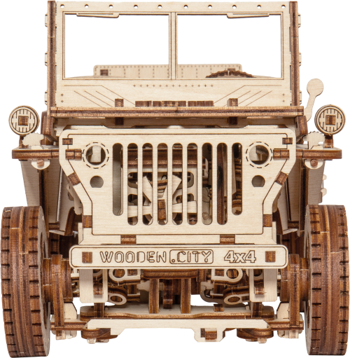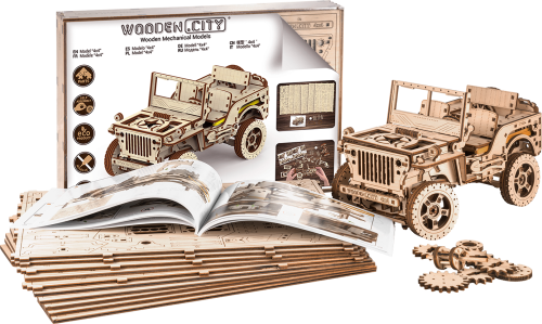 Po zostavení nastavte polohu páky na jazdu vpred alebo vzad, dajte zamykaciu páku do polohy stôp, natočte model kľúčikom (kľúč nájdete v rezervnom kolese) a potom spustite zamykaciu páku. Džíp má riadenie predných kolies. Kapota sa otvára a zatvára a je zaistená dvoma sponami a čelné sklo sa vyklápa. 3D puzzle WOODEN CITY Model 4x4 je neobvyklým darčekom pre vašich blízkych a milovníkov silných vozidiel. Obtiažnosť: 5 z 5 (podľa rozdelenia Wooden City) Orientačná doba na zloženie: 12 hodín Mierka: 1:12 Drevené 3D puzzle WOODEN CITY sú detailne prepracované funkčné mechanické modely, ktoré sa skladajú bez lepidla alebo náradia. Sú vyrobené z ekologických drevených materiálov - kvalitné brezové preglejky. S mechanickými drevenými puzzle WOODEN CITY zažijete hodiny zábavy pri skladaní a spoznáte prevody, gumičkové motory, ozubené kolieska a ďalšie súčiastky z bezprostrednej blízkosti.