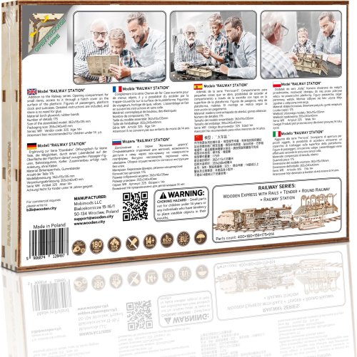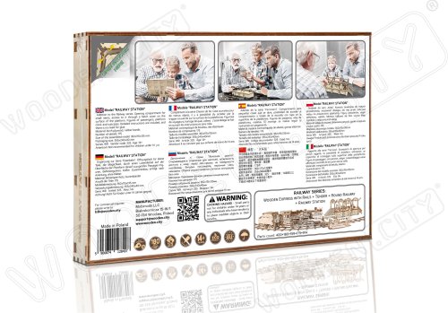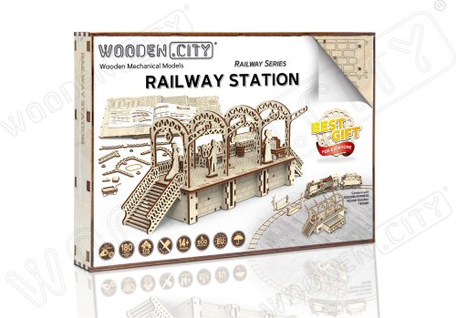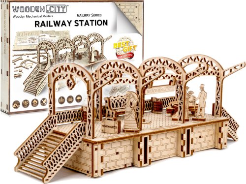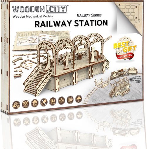 3D puzzle WOODEN CITY Railway Station je neobvyklým darčekom pre vašich blízkych a milovníkov sveta na koľajniciach. Obtiažnosť: 4 z 5 (podľa rozdelenia Wooden City) Orientačná doba na zloženie: 3 hodiny Drevené 3D puzzle WOODEN CITY sú detailne prepracované funkčné mechanické modely, ktoré sa skladajú bez lepidla alebo náradia. Sú vyrobené z ekologických drevených materiálov - kvalitné brezové preglejky. S mechanickými drevenými puzzle WOODEN CITY zažijete hodiny zábavy pri skladaní a spoznáte prevody, gumičkové motory, ozubené kolieska a ďalšie súčiastky z bezprostrednej blízkosti.