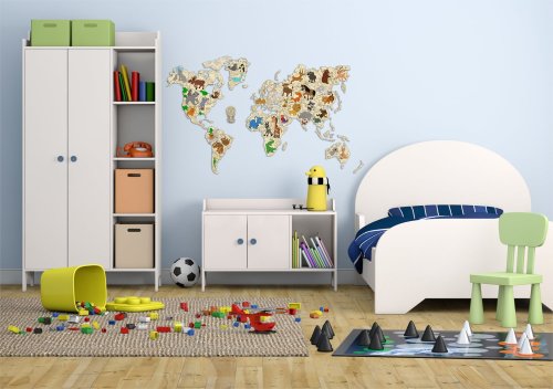 Drevené "puzzle" so zvieratkami zobrazujúcimi mapu celého sveta poslúžia ako krásna dekorácia detskej izby, ktorá priamo nabáda k vymaľovaniu. Pomocou obojstrannej lepiacej pásky ju ľahko umiestnite na stenu izbičke, dvere alebo napríklad skriňu. Originálna drevená mapa sveta je vyrezaná laserom z kvalitnej brezovej preglejky.
