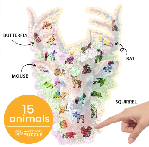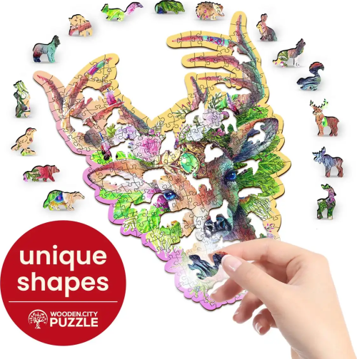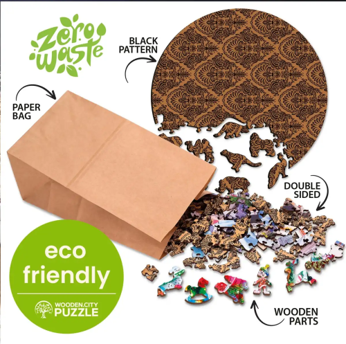 Laserom vyrezávané drevené puzzle WOODEN CITY so svojimi špeciálne tvarovanými dielikmi je neskutočne zábavné. Časť dielikov je vyrobená v tvare zvierat, ktorých výsledný efekt umocňujú laserom zvýraznené detaily. Tieto dieliky môžu samostatne stáť ako drobné figúrky. Skladanie puzzle s rôznorodými dielikmi je ťažšie a predstavuje väčšiu výzvu, než skladanie klasického puzzle. Značka WOODEN CITY okrem unikátneho konceptu puzzle nezabúda na ekológiu, u týchto výrobkov preto nenájdete žiadne plastové obaly.