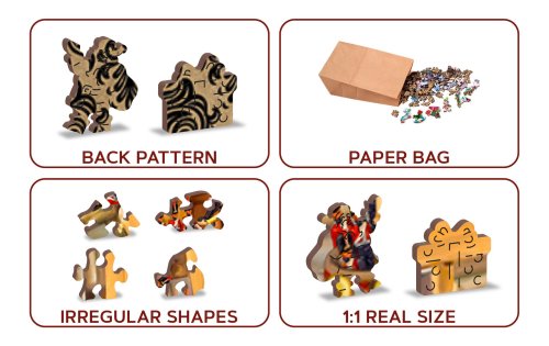 s unikátne tvarovanými dielikmi predstavujúce známe stavby, predmety alebo zvieratá podľa témy motívu vyššia obtiažnosť pri menšom počte dielikov - skladanie puzzle s rôznorodými dielikmi je náročnejšie obojstranné puzzle 2v1 - z jednej strany je obrázok, z druhej opakujúci sa vzor na skladanie podľa tvaru hladkej hrany bez triesok vďaka precíznemu laserovému spracovaniu vyrobené z pevnej drevovláknitej HDF dosky o sile 3-4mm vo vnútri balenia je samostatná predloha na skladanie EKO Friendly 100% bez plastových obalov - puzzle je v papierovom sáčku vo vnútri papierovej krabičky vhodný darček pre akúkoľvek príležitosť