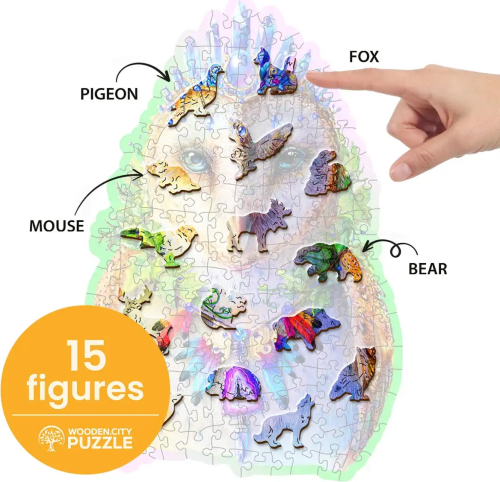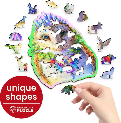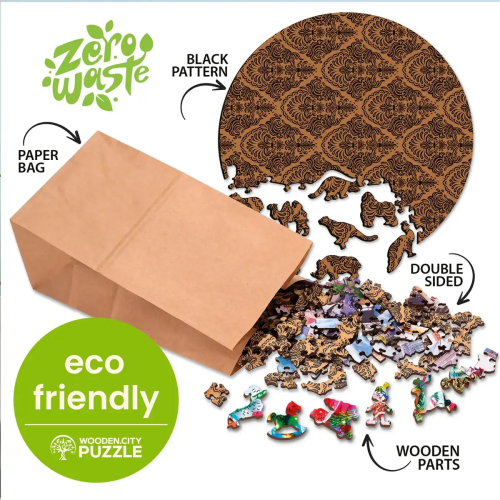 Laserom vyrezávané drevené puzzle WOODEN CITY so svojimi špeciálne tvarovanými dielikmi je neskutočne zábavné. Časť dielikov je vyrobená v tvare zvierat, ktorých výsledný efekt umocňujú laserom zvýraznené detaily. Tieto dieliky môžu samostatne stáť ako drobné figúrky. Skladanie puzzle s rôznorodými dielikmi je ťažšie a predstavuje väčšiu výzvu, než skladanie klasického puzzle. Značka WOODEN CITY okrem unikátneho konceptu puzzle nezabúda na ekológiu, u týchto výrobkov preto nenájdete žiadne plastové obaly.