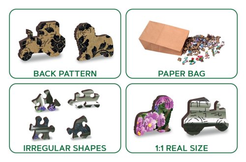 s unikátne tvarovanými dielikmi predstavujúce známe stavby, predmety alebo zvieratá podľa témy motívu vyššia obtiažnosť pri menšom počte dielikov - skladanie puzzle s rôznorodými dielikmi je náročnejšie obojstranné puzzle 2v1 - z jednej strany je obrázok, z druhej opakujúci sa vzor na skladanie podľa tvaru hladkej hrany bez triesok vďaka precíznemu laserovému spracovaniu vyrobené z pevnej drevovláknitej HDF dosky o sile 3-4mm vo vnútri balenia je samostatná predloha na skladanie EKO Friendly 100% bez plastových obalov - puzzle je v papierovom sáčku vo vnútri papierovej krabičky vhodný darček pre akúkoľvek príležitosť