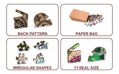 s unikátne tvarovanými dielikmi predstavujúce známe stavby, predmety alebo zvieratá podľa témy motívu vyššia obtiažnosť pri menšom počte dielikov - skladanie puzzle s rôznorodými dielikmi je náročnejšie obojstranné puzzle 2v1 - z jednej strany je obrázok, z druhej opakujúci sa vzor na skladanie podľa tvaru hladkej hrany bez triesok vďaka precíznemu laserovému spracovaniu vyrobené z pevnej drevovláknitej HDF dosky o sile 3-4mm vo vnútri balenia je samostatná predloha na skladanie EKO Friendly 100% bez plastových obalov - puzzle je v papierovom sáčku vo vnútri papierovej krabičky vhodný darček pre akúkoľvek príležitosť