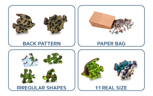 Laserom vyrezávané drevené puzzle WOODEN CITY so svojimi špeciálne tvarovanými dielikmi je neskutočne zábavné. Časť dielikov je vyrobená v tvare zvierat, stavieb alebo predmetov, ktorých výsledný efekt umocňujú laserom zvýraznené detaily. Tieto dieliky môžu samostatne stáť ako drobné figúrky. Skladanie puzzle s rôznorodými dielikmi je ťažšie a predstavuje väčšiu výzvu, než skladanie klasického puzzle. Puzzle je navyše obojstranné, skladať môžete ako podľa obrázku (lícová strana), tak podľa tvaru (rubová strana so vzorom). Značka WOODEN CITY okrem unikátneho konceptu puzzle nezabúda na ekológiu, u týchto výrobkov preto nenájdete žiadne plastové obaly.