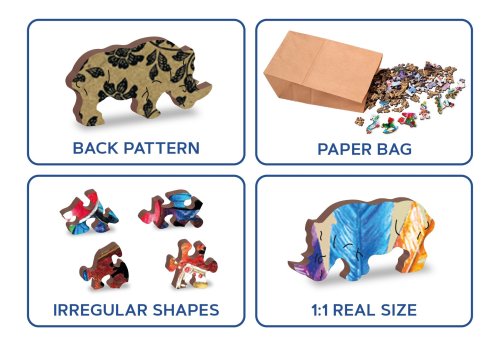 s unikátne tvarovanými dielikmi v tvare zvierat vyššia obtiažnosť pri menšom počte dielikov - skladanie puzzle s rôznotvarými dielikmi je náročnejšie hladké hrany bez triesok vďaka precíznemu laserovému spracovaniu vyrobené z pevnej drevovláknitej HDF dosky o sile 3-4mm vo vnútri balenia je samostatná predloha na skladanie EKO Friendly 100 % bez plastových obalov - puzzle je v papierovom sáčku vo vnútri papierovej krabičky vhodný darček pre akúkoľvek príležitosť