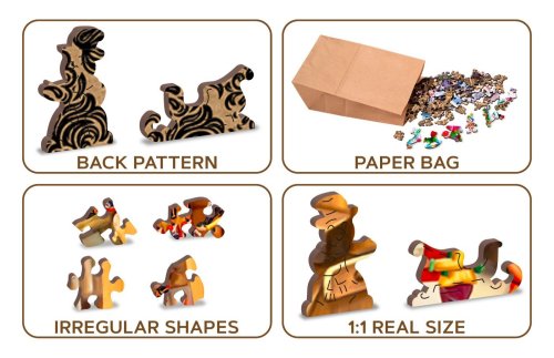 s unikátne tvarovanými dielikmi predstavujúce známe stavby, predmety alebo zvieratá podľa témy motívu vyššia obtiažnosť pri menšom počte dielikov - skladanie puzzle s rôznorodými dielikmi je náročnejšie obojstranné puzzle 2v1 - z jednej strany je obrázok, z druhej opakujúci sa vzor na skladanie podľa tvaru hladkej hrany bez triesok vďaka precíznemu laserovému spracovaniu vyrobené z pevnej drevovláknitej HDF dosky o sile 3-4mm vo vnútri balenia je samostatná predloha na skladanie EKO Friendly 100% bez plastových obalov - puzzle je v papierovom sáčku vo vnútri papierovej krabičky vhodný darček pre akúkoľvek príležitosť