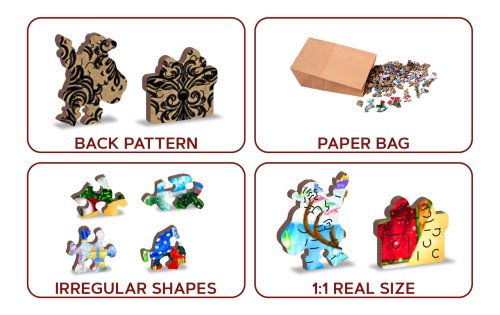 s unikátne tvarovanými dielikmi predstavujúce známe stavby, predmety alebo zvieratá podľa témy motívu vyššia obtiažnosť pri menšom počte dielikov - skladanie puzzle s rôznorodými dielikmi je náročnejšie obojstranné puzzle 2v1 - z jednej strany je obrázok, z druhej opakujúci sa vzor na skladanie podľa tvaru hladkej hrany bez triesok vďaka precíznemu laserovému spracovaniu vyrobené z pevnej drevovláknitej HDF dosky o sile 3-4mm vo vnútri balenia je samostatná predloha na skladanie EKO Friendly 100% bez plastových obalov - puzzle je v papierovom sáčku vo vnútri papierovej krabičky vhodný darček pre akúkoľvek príležitosť