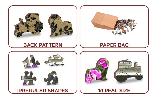 Drevené puzzle je jedinečné dobrodružstvo pre myseľ. Zábava pri aranžovaní skladačiek podnecuje fantáziu. Puzzle sú skvelý spôsob, ako stráviť príjemný večer s rodinou, pobaviť sa a rozvinúť svoje schopnosti kreatívneho myslenia. Konečný výsledok prekvapí nielen vás, ale aj vašich blízkych! Jedinečnosť každého prvku robí z aranžovania týchto hlavolamov skutočnú výzvu pre všetkých, dospelých aj deti. Drevené laserom rezané puzzle so špeciálne tvarovanými prvkami. Niektoré prvky sú vyrobené v tvare zvierat, budov alebo predmetov, ktorých konečný výsledok je umocnený laserom vylepšenými detailmi. Každý z týchto prvkov sa môže objaviť samostatne ako malé postavy. Skladať puzzle z rôznych dielikov je ťažšie a náročnejšie ako skladať klasické puzzle. Puzzle sú navyše obojstranné, je možné ich zoradiť ako podľa fotografie (predná strana), tak aj podľa tvaru (zadná strana so vzorom). Ak hľadáte perfektný darček, puzzle sú nadčasovým a vždy tým správnym darčekom pre každú príležitosť! Puzzle obsahuje mnoho jedinečných obojstranných figúrok. Každý z 200 prvkov je iný. Aranžované puzzle sa môžu stať zaujímavou ozdobou vášho interiéru. Značka nezabúda ani na ekológiu, preto u týchto výrobkov nenájdete žiadne plastové obaly. Materiál: 100% bezpečný pre deti. Počet dielov: 505. Hrúbka: 3-4 mm. Rozmer v zloženom stave: 375mm x 254mm. Doba skladania: 120-180 min. Vek: 8+