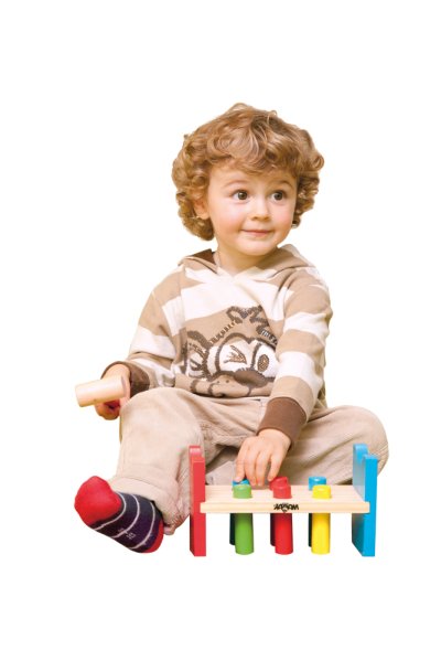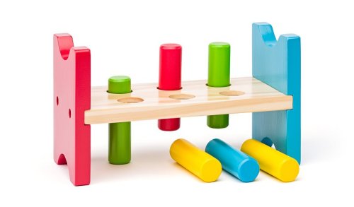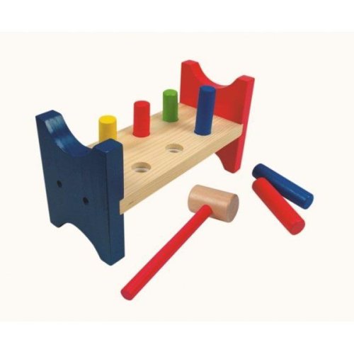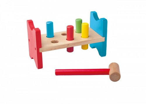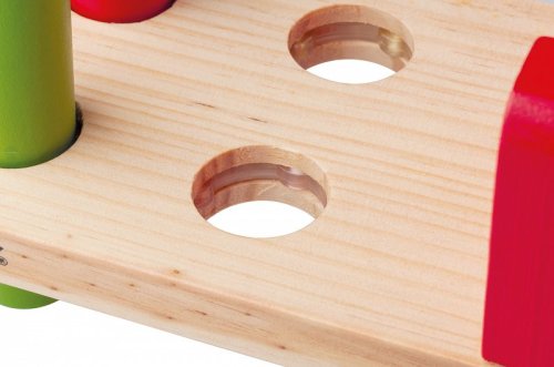 Kolíky zatĺkačky treba správne nasadiť a potom zatĺcť drevenou paličkou Keď je zatlčené, obráťte zatĺkačku na druhú stranu a dieťa môže vo svojej činnosti pokračovať Hračka je vhodná pre rozvoj jemnej i hrubej motoriky dieťaťa