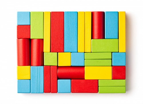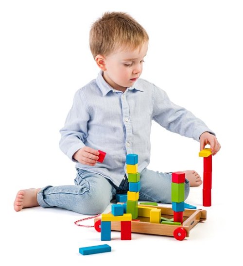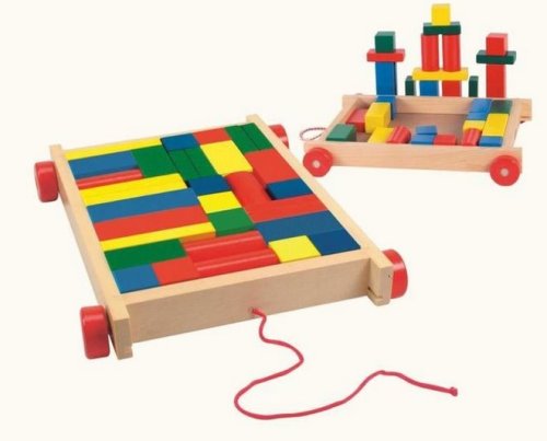 Vozík obsahuje 34 farebných kociek Dieťa sa učí rozlišovať ich farby a tvary, stavať s nimi a rovnať ich späť do vozíka Hračka rozvíja jemnú motoriky a logiku