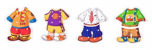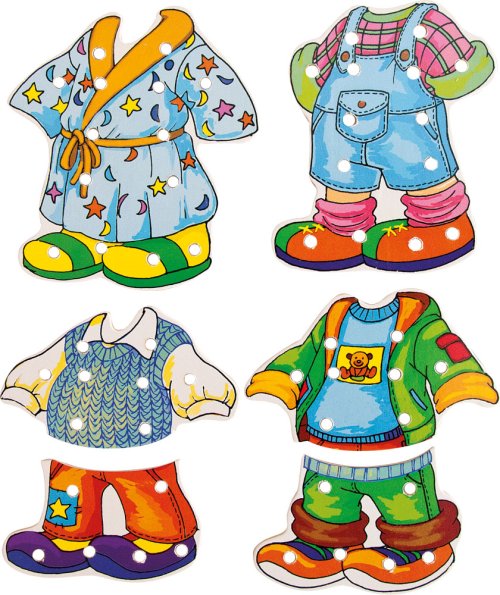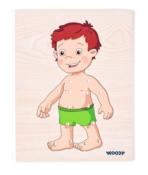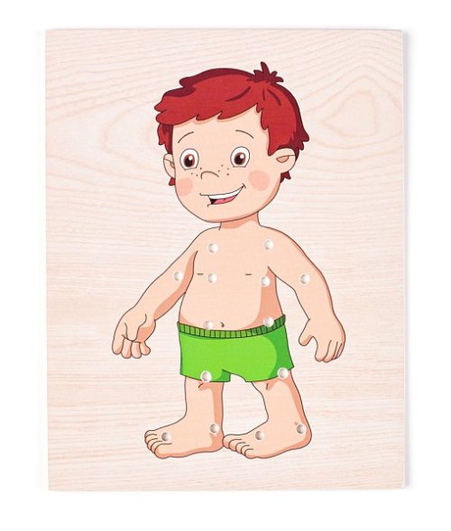 Deti podľa vlastnej fantázie obliekajú postavičku chlapčeka K dispozícii majú niekoľko variant oblečenia Chlapec namaľovaný na vysúvacom veku krabičky má na tele otvory, ktoré umožňujú prichytenie oblečkov šnúrkami