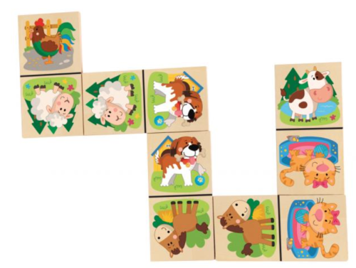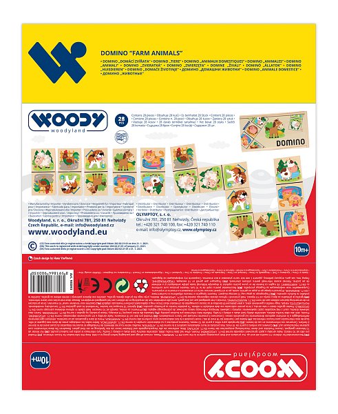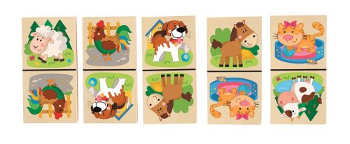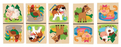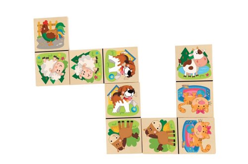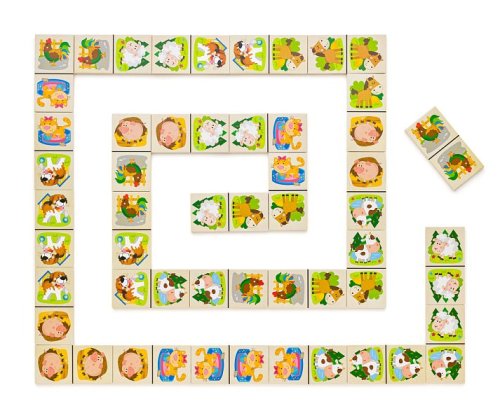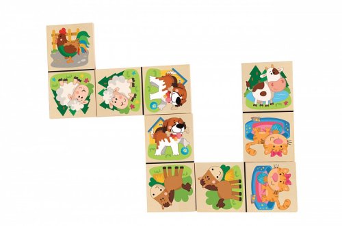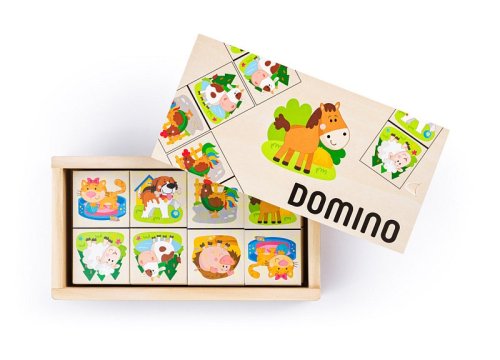 Klasické kamene domina sú oživené veselými obrázkami domácich zvieratiek Z dielne českej kreslírky Tak, ako u klasického domina, má dieťa za úlohu radiť vedľa seba obrázky s rovnakými zvieratkami Domino je uložené v drevenej krabičke