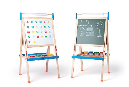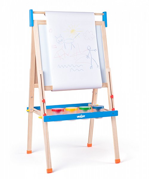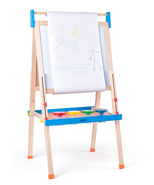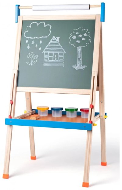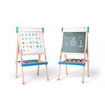 Obojstranná tabuľa s nastaviteľnou výškou Z jednej strany je zelená plocha na písanie kriedami Z druhej strany biela magnetická plocha na písanie fixkou Nad tabuľou je do konštrukcie zabudovaná tyčka na upevnenie rolky papiera Papier je možné odvíjať a maľovať na ploche, ktorú poskytujú dosky tabúľ, obsahuje magnetické písmená, biele farby