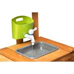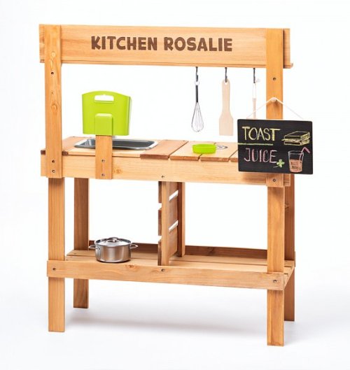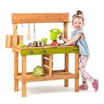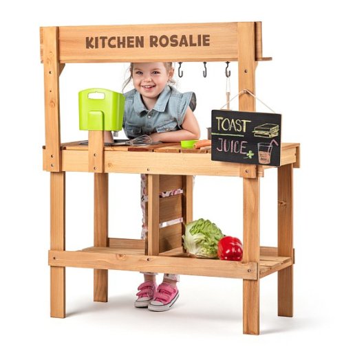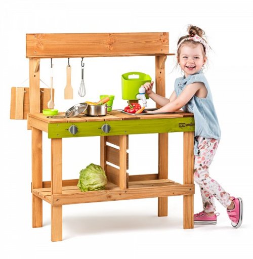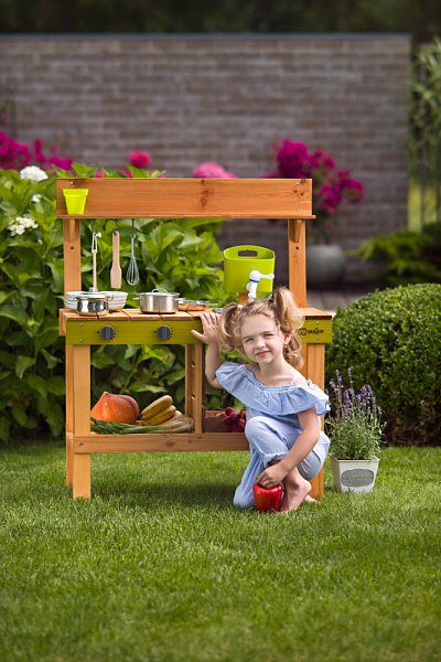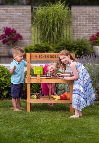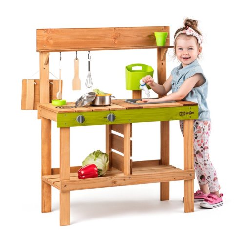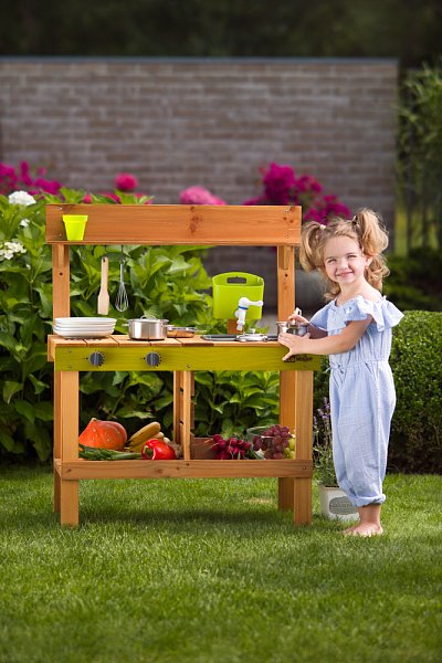Z jednej strany kuchynka s dvoma varičmi, z druhej výdajňa jedál Súčasťou kuchynky je zásobník na vodu Vďaka ktorému môže dieťa skutočne omývať ovocie, zeleninu, ale aj riad a náčinie, ktoré je súčasťou tohto výrobku Hra s vodou deti nadchne a plnenie zásobníka sa tak stane veľmi populárnou činnosťou Drez pod kohútikom je vyberateľný a môže sa tak vy pokrmov Na čiernu tabuľku z výdajnej strany kuchyne môžu deti napísať či nakresliť, aké jedlo dnes pre svojich kamarátov pripravili Záhradná kuchynka je ošetrená glazúrou vhodnou pre deti a je šetrná k životnému prostrediu
