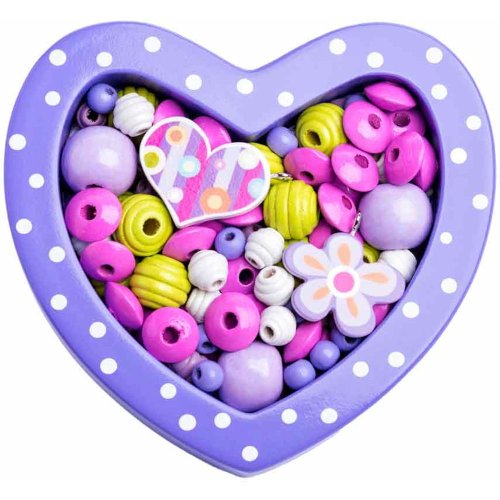 Sada obsahuje veľké množstvo korálikov rôznych tvarov Súčasťou tiež tenké šnúrky s koncovkou na prevliekanie Vhodné pre rozvoj jemnej motoriky Balené v drevenej krabičke v tvare srdiečka