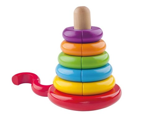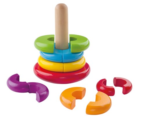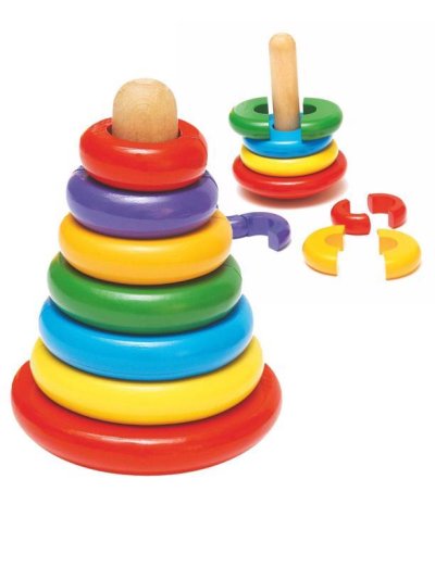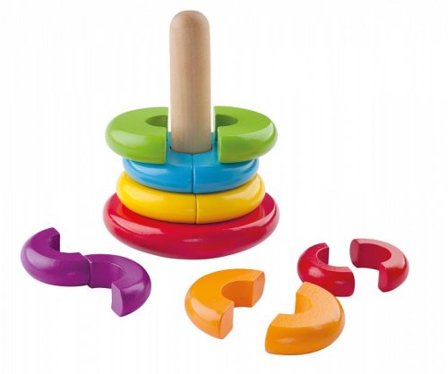 Úlohou dieťaťa je navliecť krúžky od najväčšieho k najmenšiemu Každý navliekací krúžok je tvorený dvoma polkruhmi spojenými silným magnetom Dieťa si musí najprv polkruhy spojiť a potom ich navliecť na tyčku
