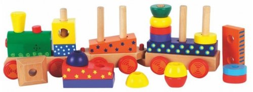 Drevený skladací vlak má mašinku a dva vagóniky Na každú jeho časť sa dajú navliecť farebné kocky a tvary Lokomotíva svieti a pri stlačení komína hrá Batérie 2x AAA sú súčasťou balenia