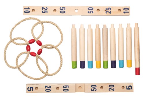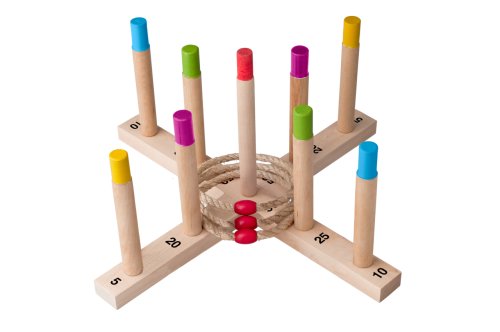 Zábavný spôsob, ako trénovať obratnosť Cieľom je hádzať 5 pletených povrazových krúžkov na drevený kríž s tyčkami a získať čo najviac bodov