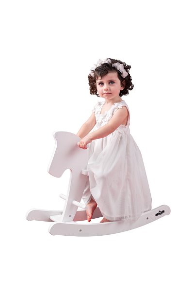 Elegantný hojdací biely koník neurazí interiér žiadnej detskej izbičky Svojimi čistými líniami spĺňa všetky parametre modernej hračky Jeho konštrukcia je čistá a funkčná Tvar hojdadiel umožňuje bezpečné hojdanie, podpierky nôh potom pohodlie a oporu pri rozhojdaní koníka Samozrejmosťou sú aj držadlá pre ruky